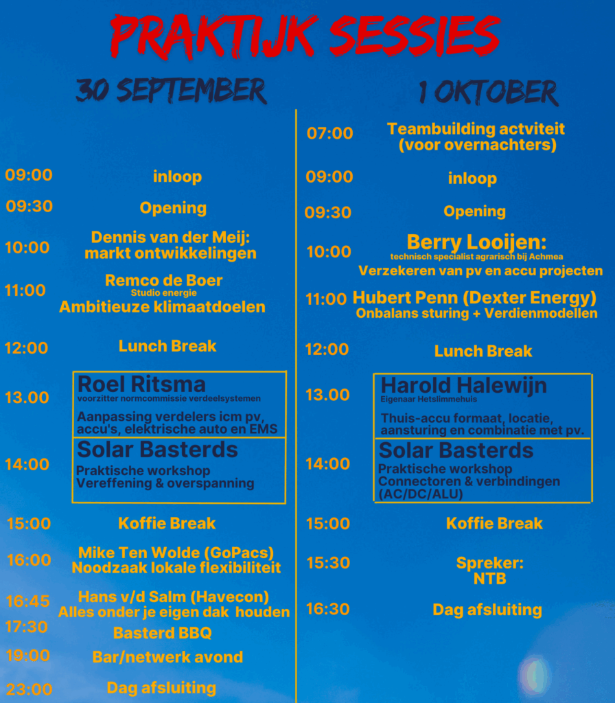De meeste events over verduurzaming zitten vol verkooppraat, gesponsorde keycords en gladde verhalen. Bij de Solarbasterds doen we daar niet aan mee. Geen verborgen agenda’s, geen deals met fabrikanten, geen praatjes voor de bühne. Onze sprekers worden betaald om hun kennis te delen en niet om je via hun datasheet jou iets te verkopen. Wat je krijgt, is eerlijke, rauwe informatie van mensen die de energietransitie dagelijks van dichtbij meemaken. Zonder filter. Zonder marketing. Maar in een uniek concept waarbij Samenwerken en kennisdelen centraal staat.